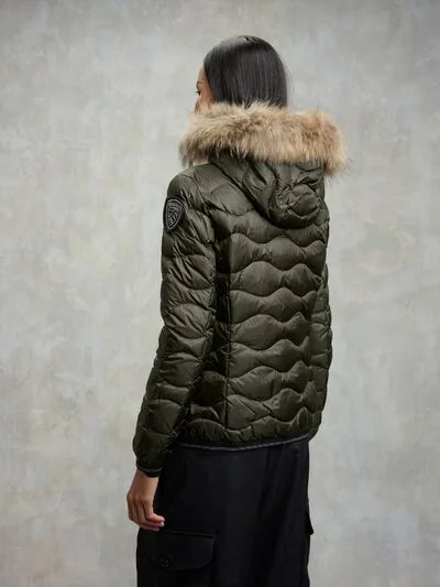 Piumino idrorepellente con trapuntatura a onde orizzontali e bordo cappuccio in vera piuma. Capo iconico Blauer con imbottitura naturale, calda e poco ingombrante, per essere sempre alla moda.