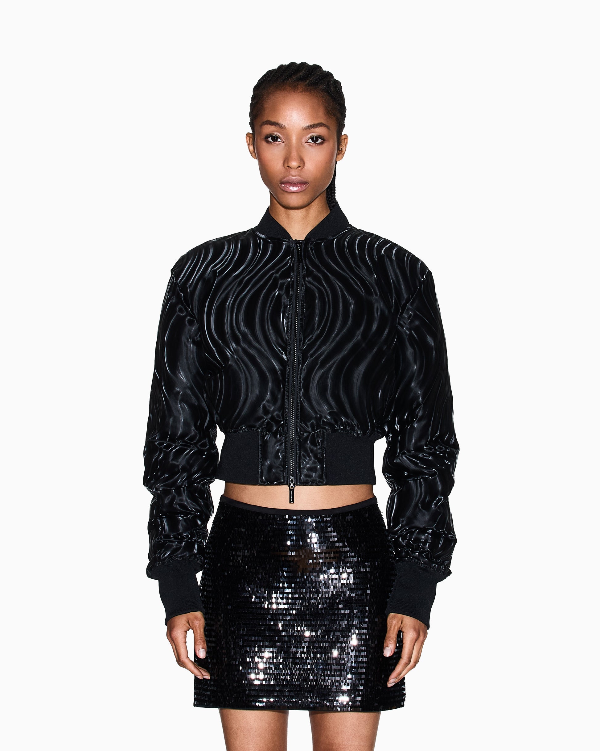 Bomber corto realizzato in tessuto tecnico con una particolare lavorazione goffrata che crea un motivo ondulato tono su tono, ideale per un look dinamico e sofisticato. Questo capo reinterpreta un classico dell'urbanwear con un tocco di eleganza contemporanea, perfetto per le serate milanesi. La texture tridimensionale cattura la luce, conferendo movimento e profondità al design essenziale. Tessuto: 100% poliestere; spalmatura esterna: 100% poliuretano; dettagli in maglia: 98% poliestere, 2% elastan; imbottitura: 100% poliestere; fodera: 100% poliammide.