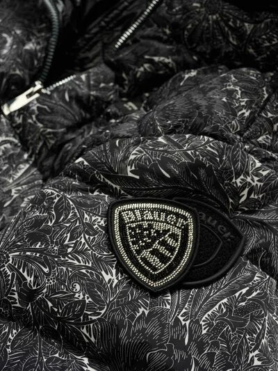 Cappuccio fisso. Realizzato in nylon stampa fashion. Foderato in nylon contrasto colore. Imbottito piuma 90/10 gr.250. Chiusura con zip. Copri cursore sul collo. Tasche con zip. Fondo manica con elastico interno. Due tasche interne con velcro. Patch con glitter e passante con logo.