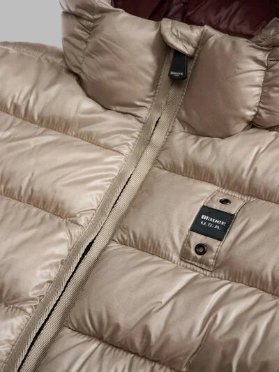 Cappuccio fisso con coulisse, realizzato in nylon micro rip con delicata fantasia a quadri, foderato in nylon a contrasto, imbottito con ovatta Sorona® Aura, chiusura con zip nascosta, copri-zip sul collo, tasche con zip e copri-zip, coulisse sul fondo, tasche interne, una con zip e una con velcro, patch con logo e passante.